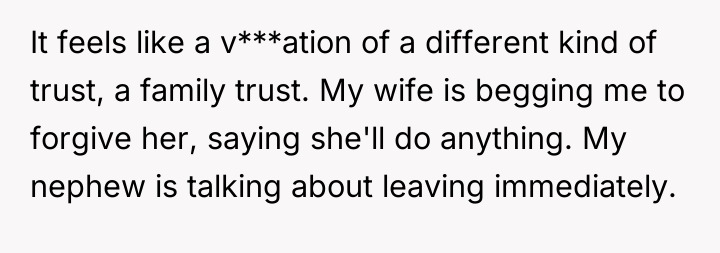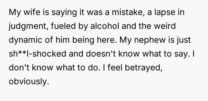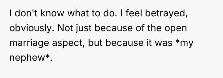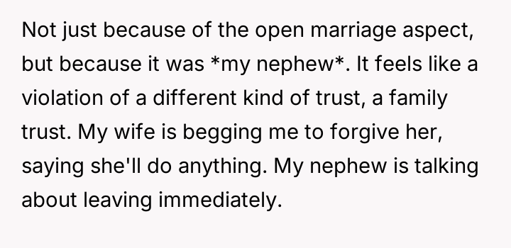 The original poster (OP) is experiencing profound emotional distress, feeling deeply betrayed because the infidelity involved his nephew, which introduces a severe breach of family trust layered onto the existing boundaries of their open marriage. His wife is seeking forgiveness based on it being a mistake, while the nephew wishes to flee the situation, leaving the OP caught between feelings of personal betrayal and confusion over how to proceed.