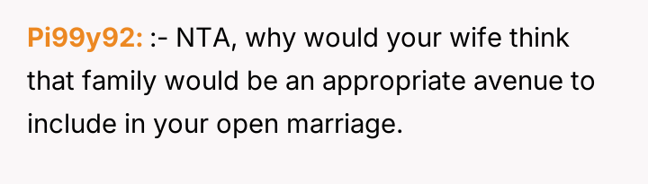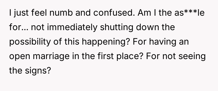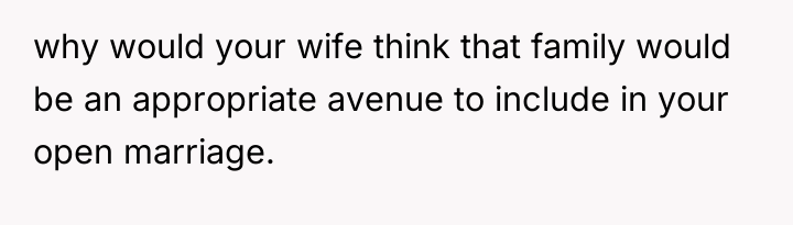 Should the OP prioritize the violation of family integrity over the pre-existing agreement of their open marriage, or is the entire concept of their relationship structure fundamentally incompatible with maintaining necessary familial boundaries? Is forgiveness possible when the breach involves such a close, protected family member?
