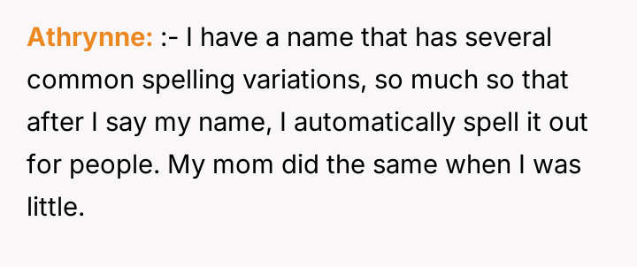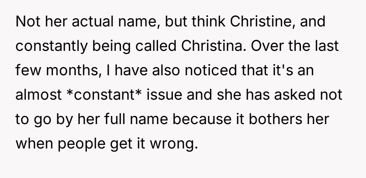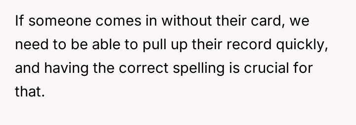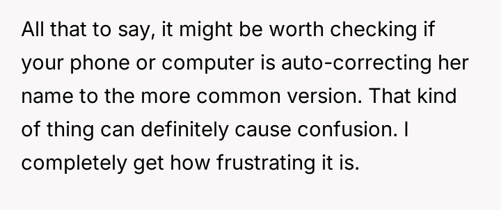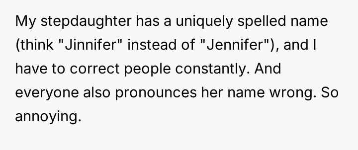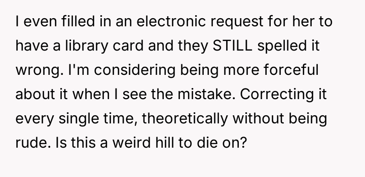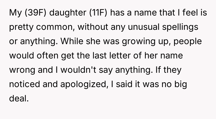 The situation highlights a common parental dilemma concerning validating a child's emotional reality versus maintaining social ease. The OP initially minimized the misspellings, viewing them as minor social friction, which may have inadvertently communicated to the daughter that her discomfort was not a priority. However, the daughter's request to avoid her full name indicates that the issue has transitioned from a simple clerical error to a source of personal frustration and self-consciousness. Supporting the daughter now is an act of validating her experience; the name is intrinsically linked to identity, and constant invalidation, even unintentional, can chip away at self-esteem. The core issue is not the commonality of the name, but the consistency of the error and the resulting emotional burden on the child.