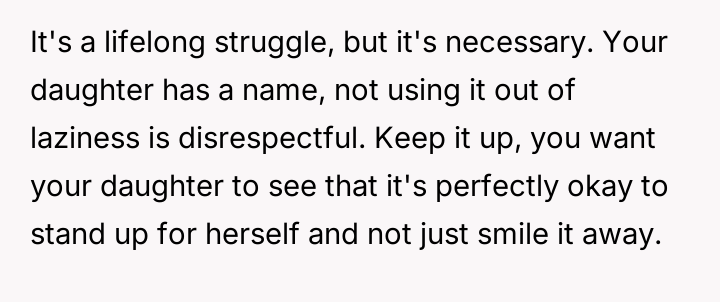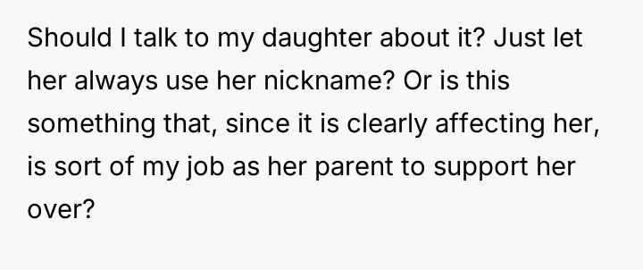 The OP's consideration of being more forceful is appropriate if done respectfully, as it signals to others that the daughter's identity matters. However, the most constructive path forward involves a partnership with the daughter. The parent should support the daughter in choosing a strategy—whether it is consistently correcting others or formally adopting the nickname—and then back that decision fully. If they choose to correct, they should practice a brief, non-aggressive script together (e.g., "Actually, it's [Correct Spelling]"). This approach teaches the daughter agency in managing her personal presentation while ensuring the parent acts as a strong advocate for her emotional well-being.