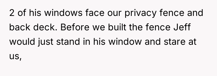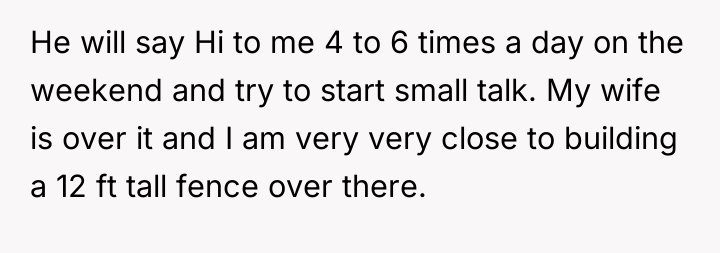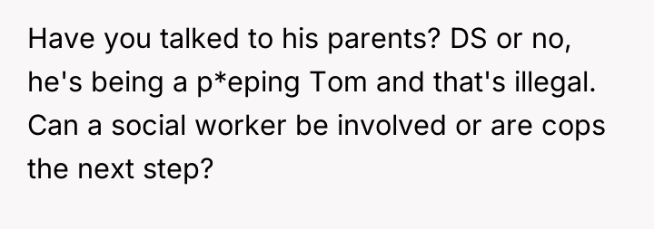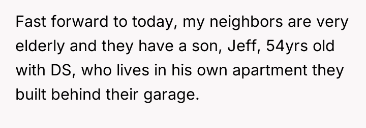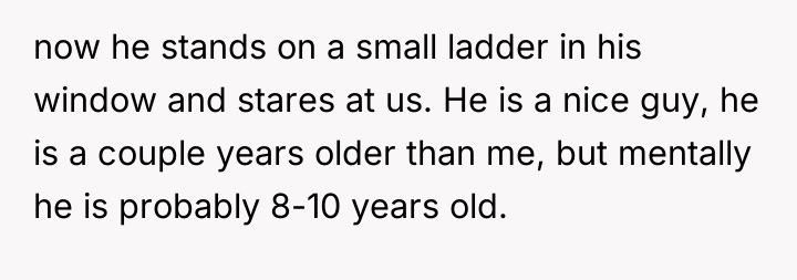 The OP’s motivation to build a 12ft fence stems from repeated boundary violations—staring, shining lights, and constant demands for interaction—which have escalated despite previous parental intervention. While the son's behavior (staring, needing attention) is likely driven by loneliness, a lack of impulse control, or underdeveloped social skills associated with his Down Syndrome (DS), the effect on the OP's household is significant stress and a loss of sanctuary on their private property. The OP's wife has reached a breaking point, making the desire for an immediate, definitive physical solution understandable. However, an extreme physical barrier like a 12ft fence can permanently damage neighborly relations, especially with elderly neighbors who may feel isolated or ashamed.