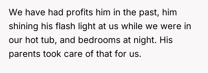 The OP's actions are understandable given the ongoing harassment, but the proposed solution (a 12ft fence) is likely an overreaction that escalates the situation unnecessarily. A more constructive approach would be a final, calm meeting with the parents. This conversation should focus not on punishing the son, but on establishing non-negotiable, agreed-upon rules for outdoor interaction—such as scheduled times for greetings, or a clear signal (like a specific gesture from the parents) that means the son must immediately return inside when the OP is using the hot tub or is clearly engaged in private activity.