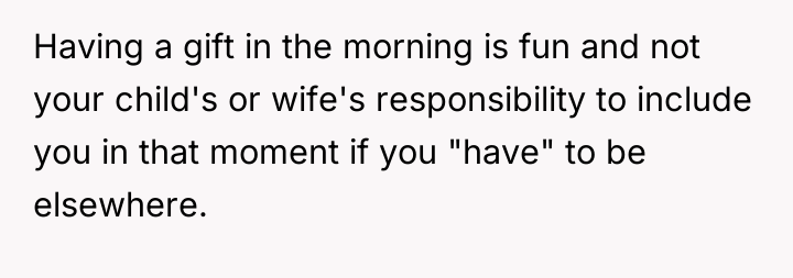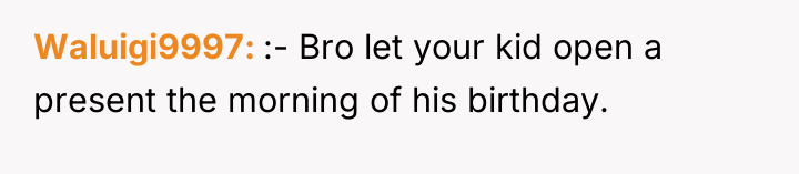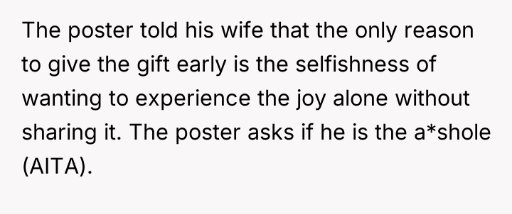 In the tender space between love and misunderstanding, he confronts the pain of missing out on his child’s excitement firsthand. What should be a celebration of togetherness becomes a test of trust and intention, as he questions whether the early gift was a thoughtful kindness or a selfish act that steals from their shared joy.