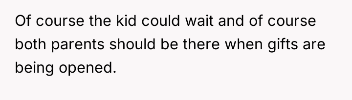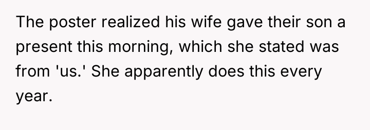 Was the wife justified in presenting the gift from both parents alone to avoid disappointing the young child, or did her action disrespect the OP's desire to share in that significant moment? Should the OP prioritize the immediate happiness of the child over maintaining a shared ritual for gift-giving?