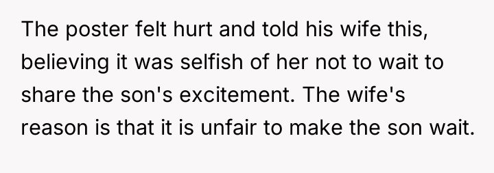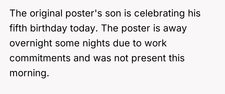 The original poster (OP) is clearly feeling hurt and excluded because his wife presented their son's birthday gift from both parents on the morning of his fifth birthday, while the OP was away for work. The central conflict lies between the OP's belief that the gift presentation should have been a shared experience later in the day, and the wife's insistence that making the child wait until the planned weekend party is unfair to him.