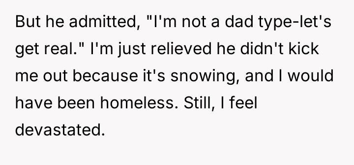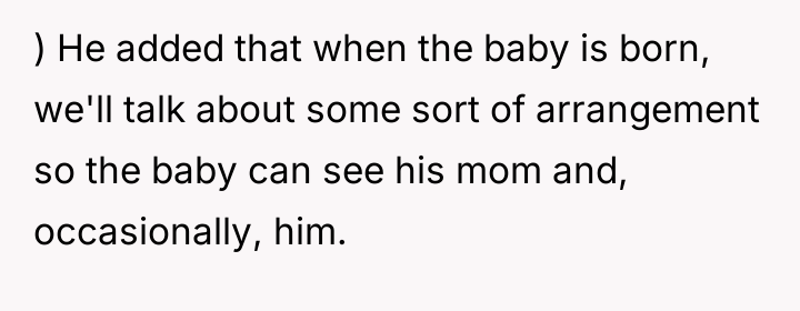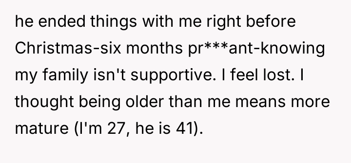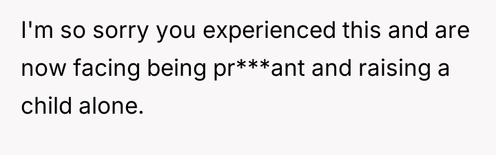 The OP’s actions immediately following the sexual incident were a result of a profound violation, though the partner dismissed this. Professionally, the partner’s behavior—criticizing her body and then leaving her while she is pregnant and facing potential housing insecurity—is highly inappropriate. The constructive recommendation for the OP is to immediately pivot focus from relationship reconciliation or external validation (what family/friends think) toward securing her financial and housing stability, while leveraging available legal and social support systems for co-parenting arrangements, rather than relying on his admission that he is 'not a dad type.'