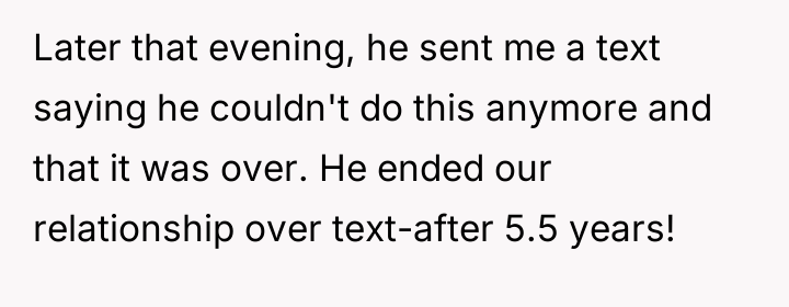The original poster is facing significant emotional devastation after her partner of five and a half years abruptly ended the relationship via text message while she is six months pregnant. The central conflict lies between her expectation of commitment and support during a difficult pregnancy and his stated desire to leave due to dissatisfaction with her physical and lifestyle changes, culminating in a severe breach of trust regarding sexual intimacy.