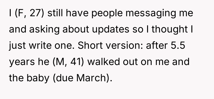 The incident involving sexual intimacy while the OP was asleep represents a critical failure of boundaries and communication, leading the OP to react with extreme language. While the partner’s subsequent decision to end the relationship over text, especially during pregnancy, reveals a severe lack of respect and emotional maturity (particularly given the 14-year age gap), the relationship was already characterized by underlying resentment from the partner. His stated reasons—dislike of her physical and life changes—indicate a deep incompatibility and a failure on his part to accept the realities of shared adult life and impending parenthood.