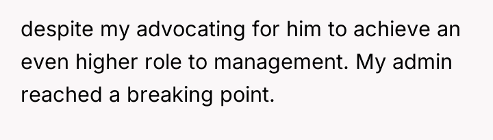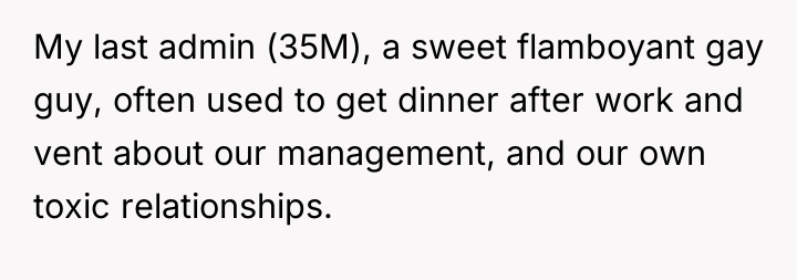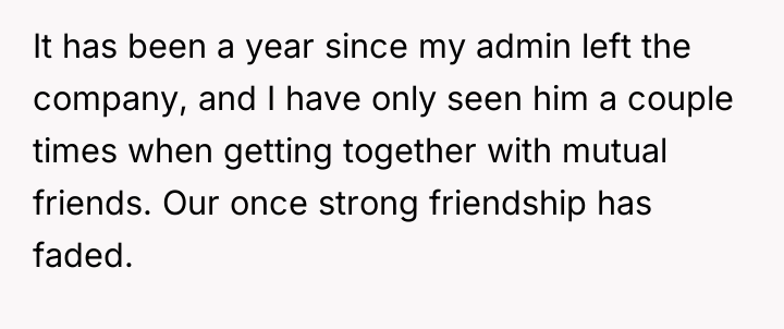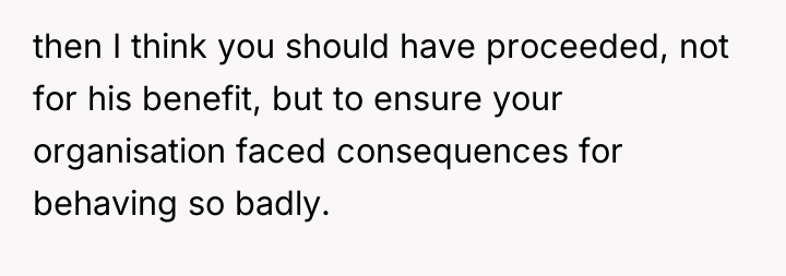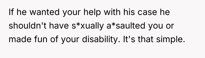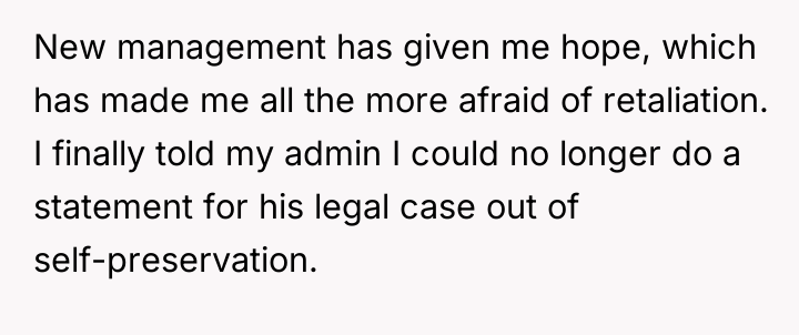 The OP was caught between two harmful dynamics: the past behavior of the former admin, which included unprofessional harassment and later, mockery of her disability, and the potential professional retaliation from the company if she supported a lawsuit that might have been viewed unfavorably by current management, especially given her positive trajectory. Her decision to prioritize self-preservation by declining to provide a statement is a rational response to a perceived threat to her career stability, particularly under new management where she sees hope for the future. However, the former admin's past offensive behavior (sexual harassment while intoxicated) and his subsequent attack on her character after she withdrew support illustrate a failure in setting and maintaining appropriate interpersonal boundaries, both during their professional relationship and afterward.