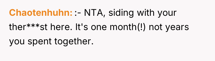The poster is facing a situation where his girlfriend's emotional needs are potentially overwhelming for a one-month-old relationship. While his desire to be a supportive partner is commendable, it is crucial to recognize that romantic partners are generally not equipped to serve as primary mental health crisis responders; that role belongs to qualified professionals. The therapist’s advice to prioritize self is sound, as attempting to support someone through suicidal ideation without professional boundaries or training can lead to compassion fatigue, burnout, and a significant decline in the supporter’s own mental health.