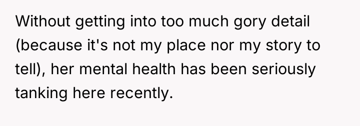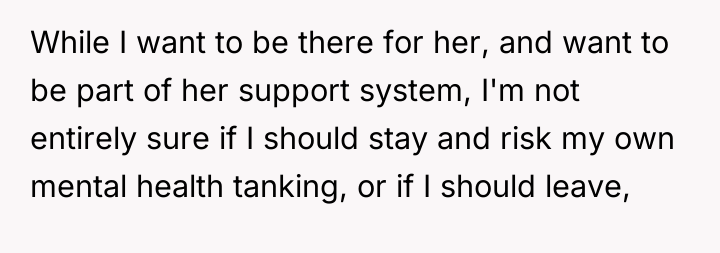 The original poster is caught in a painful conflict, caring deeply for a girlfriend whose severe mental health struggles include suicidal ideation, yet feeling compelled to prioritize his own mental well-being. His dilemma centers on whether staying to offer support is sustainable or if leaving, despite the devastating impact it might have on her, is a necessary act of self-preservation.