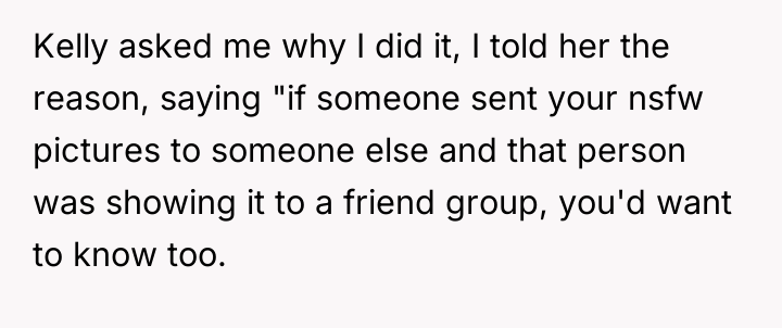 The OP’s action of informing the girl was ethically justifiable given the context of protecting someone from the misuse of their image. However, the communication strategy could have been improved. A constructive recommendation for the future would be to clearly state boundaries when receiving sensitive information: for example, telling Kelly immediately, “If you show me private content about someone else, I will feel obligated to ensure that person knows about it.” This sets expectations beforehand, minimizing interpersonal fallout later.