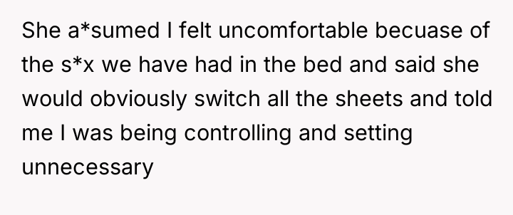 The boyfriend (OP) is attempting to establish a soft boundary around a specific item—the marital/couple's bed—viewing it as an intimate zone reserved for the couple. His motivation appears rooted in personal comfort and the symbolism of that space, even acknowledging it might be 'selfish.' Conversely, the girlfriend interprets this boundary as controlling, perhaps feeling that if the OP trusts her, he should trust her friends in their shared space, or she might be reacting defensively to what she perceives as an unjustified restriction on her hosting rights.