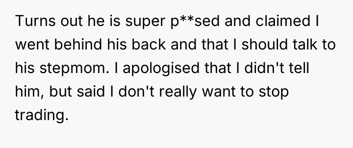 The OP's actions were inappropriate primarily due to the breach of trust through non-disclosure, especially concerning a key family figure. To handle this better, the OP should immediately halt the trading activity until full, honest communication is achieved. Future effectiveness requires establishing clear, shared boundaries regarding interactions with family members, ensuring that significant, long-term arrangements involving the extended family unit are discussed and agreed upon beforehand, thus prioritizing partnership alignment over independent transactional benefits.
