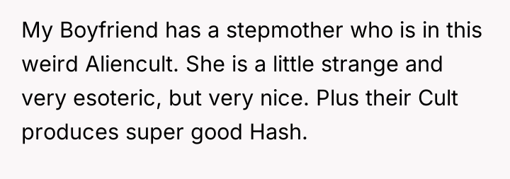 Beneath the surface of a seemingly ordinary relationship lies a tangled web of secrets and silent agreements, where family ties are strained by unspoken truths. The boyfriend’s stepmother, wrapped in the mystique of an alien cult, hides a clandestine habit that bridges worlds—her esoteric kindness masking a rebellious streak that connects her to the narrator through the shared ritual of smoking and trade. This delicate balance of trust and deception pulses quietly, threatening to unravel.