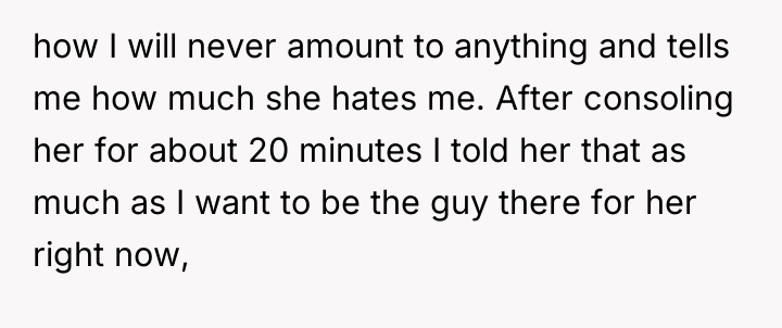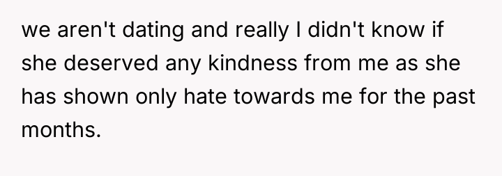 The original poster experienced a strong internal conflict, feeling compelled by residual care to comfort his ex-girlfriend after a traumatic event, yet simultaneously feeling justified in withdrawing support due to her consistent pattern of verbal abuse and negativity toward him. His action of setting a boundary by refusing to be her primary emotional support contradicted his own past behavior of staying connected despite the poor treatment he received.