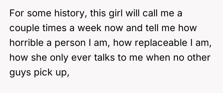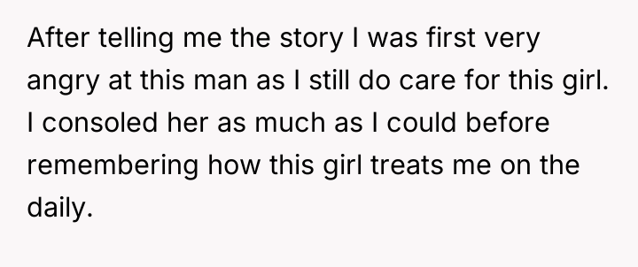The situation highlights a classic dynamic where emotional obligation clashes sharply with self-preservation. The OP demonstrated genuine compassion for the ex-girlfriend's immediate trauma, which is a natural human response, especially given lingering affection. However, this immediate empathy was immediately challenged by the established pattern of the relationship: the ex-girlfriend uses the OP as a fallback option, subjecting him to daily verbal abuse and devaluation when other options are unavailable. This creates a highly toxic dynamic where the OP is performing emotional labor without receiving basic respect or reciprocity.
