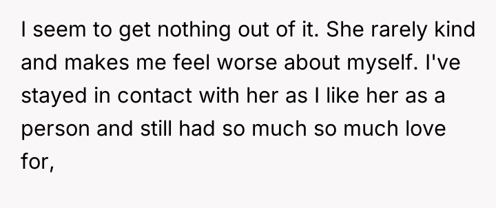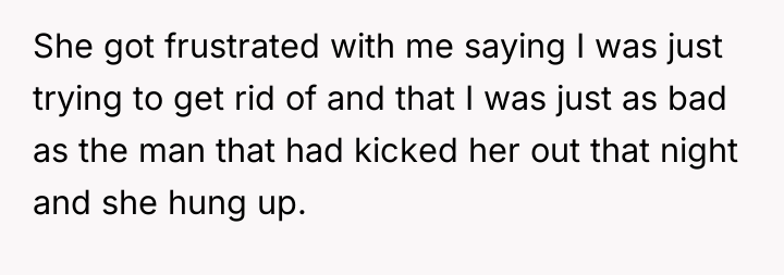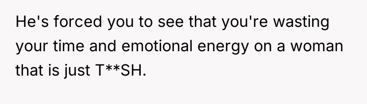 The OP's decision to confront the imbalance—stating that he questioned if she deserved kindness given her treatment of him—was an attempt to establish a boundary. The ex-girlfriend's reaction (frustration, accusation of being 'just as bad' as the perpetrator, and hanging up) confirms that she values the OP only for his availability, not for his well-being. The OP's realization regarding physical intimacy and the overall transactional nature of the relationship serves as a critical turning point. The appropriate action here is to enforce the boundary initiated during the call. A constructive recommendation is for the OP to cease contact immediately. Continuing communication will only reinforce the idea that the OP is available for crisis support while absorbing abuse during stable times. True self-care requires cutting off relationships that consistently erode self-worth.