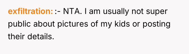 As renowned researcher Dr. Brené Brown explains, “Boundaries are the distance at which I can love you and me simultaneously.” This situation highlights a difficult boundary negotiation between two friends concerning content shared online about a third party (the child). The OP established a personal boundary regarding what they are comfortable viewing and implicitly suggested a boundary regarding what should be publicly shared, rooted in concerns about digital permanence and child safety.