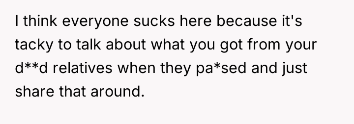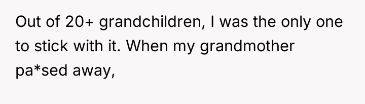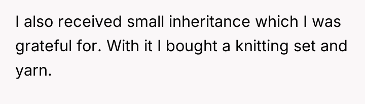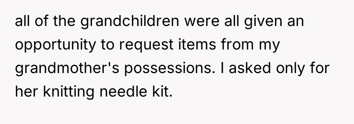 The original poster (OP) feels deeply wronged because a specific set of knitting needles, highly meaningful due to their connection to their late grandmother and their unique skill, was claimed by a cousin who does not share the hobby and stored them improperly. The central conflict lies between the OP's legitimate sentimental claim and their perceived right to use the item versus the family's sudden defense of the cousin, suggesting the OP's request was viewed as aggressive or demanding, despite the cousin having received a significantly larger inheritance.