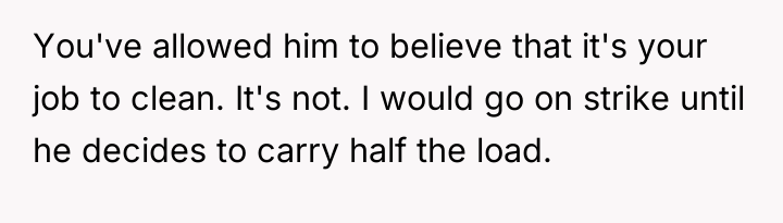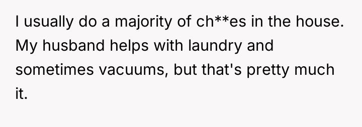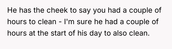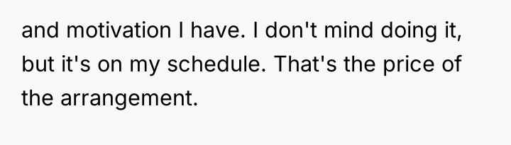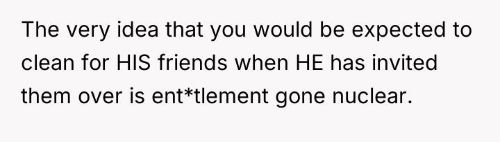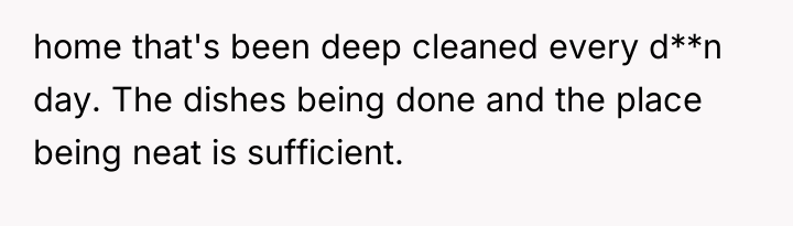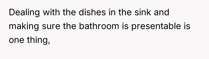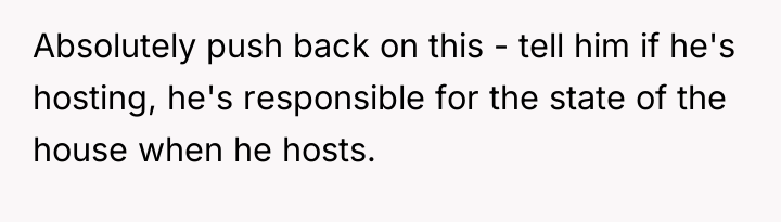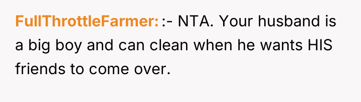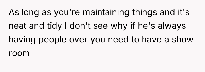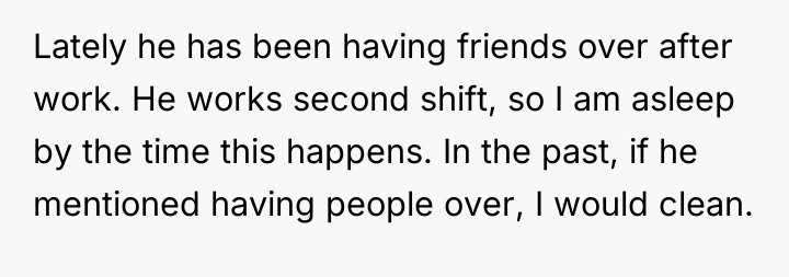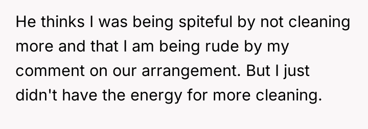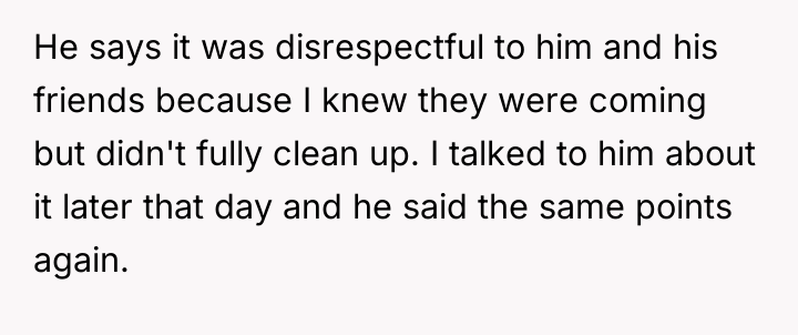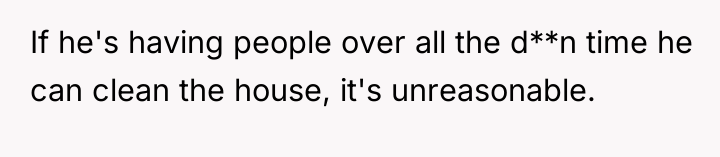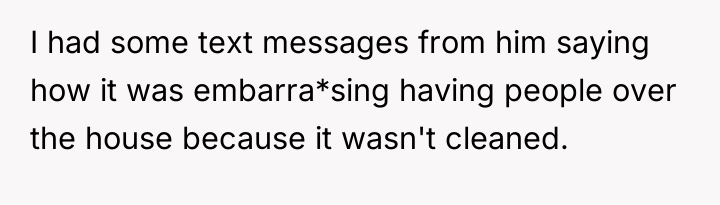 The husband’s reaction suggests a misalignment of emotional labor expectations. While the OP handles the bulk of daily cleaning, hosting often requires an immediate 'show ready' state. His texts indicating embarrassment highlight that his need for social approval superseded his understanding of his wife's current capacity. The OP’s response—asserting that the arrangement means cleaning is done only on her timeline—while factually correct under their existing agreement, was delivered defensively and felt spiteful to the husband because it dismissed his immediate social need entirely.