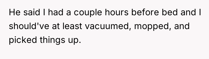 As renowned researcher Dr. Brené Brown explains, “Boundaries are the distance at which I can love you and me simultaneously.” In this situation, the dynamic hinges on unspoken and inconsistently applied boundaries regarding shared domestic labor and social hosting expectations. The OP operates under a system where they control the pace and scope of their labor, while the husband accepts this arrangement because things get done eventually. However, hosting guests introduces a public performance element that disrupts this private agreement, leading the husband to impose an external standard of cleanliness (vacuuming, mopping) that the OP was unwilling or unable to meet due to fatigue.