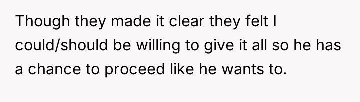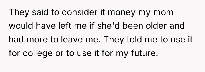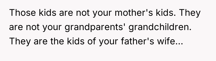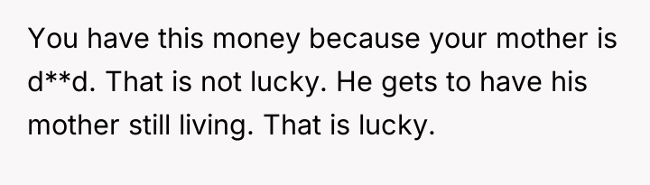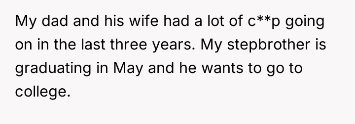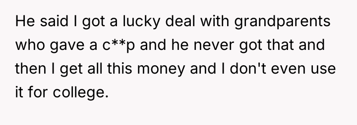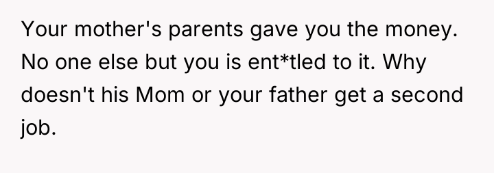 The stepbrother's text message reflects the toxic environment created by the parental pressure; he has been socialized to believe the OP owes him a portion of the funds. The OP was appropriate in firmly shutting down the direct demands and refusing to engage with yelling or manipulation. Moving forward, the OP should maintain a firm boundary regarding the principal amount and communication frequency. If necessary, they should limit contact with the father regarding this topic, focusing future discussions only on their independent life choices rather than defending their financial decisions.