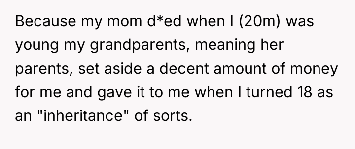The situation highlights a significant boundary violation initiated by the OP's father and stepmother. The inheritance was explicitly designated by the grandparents for the OP's future, not as a general family fund. By pressuring the OP for $50k, or the entirety of the fund, the parents are attempting to exert financial control over an asset legally and ethically belonging to the 20-year-old. The father's anger stems from feeling excluded from the initial inheritance decision and now viewing the OP's money as a resource to solve the current financial gap for the stepson, showing a lack of respect for the OP’s autonomy.