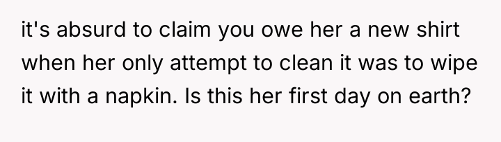 Was the OP justified in leaving the situation after apologizing and cleaning the immediate mess, or did refusing to pay for the shirt constitute a failure to take responsibility? Does an accidental spill, even in a public space, automatically obligate the spiller to cover all resulting material costs demanded by the affected party?