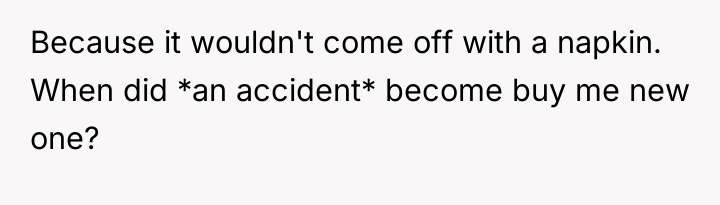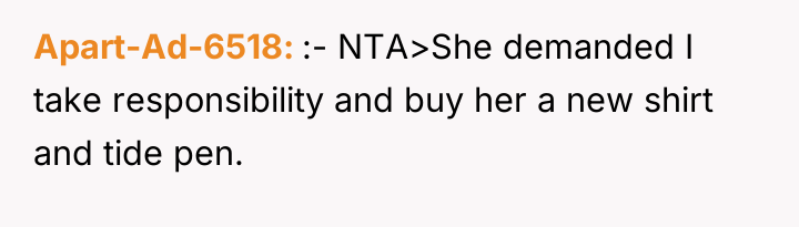 The OP's immediate reaction—apology and cleanup—is generally considered the appropriate social response to an accidental spill. The situation escalated because the other party shifted the focus from the accident itself to demanding restitution (a new shirt and Tide pen). While accidents happen, the demand for payment, especially while the OP was actively cleaning up the hazard, suggests an expectation of total fault assignment rather than mutual understanding. The OP’s decision to leave was likely an act of self-preservation to manage overwhelming emotional escalation, especially while managing young children, prioritizing safety over protracted negotiation.