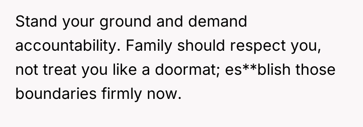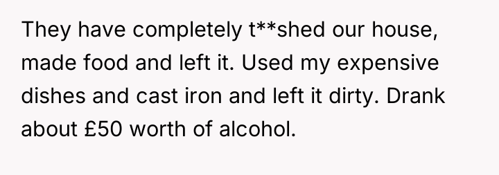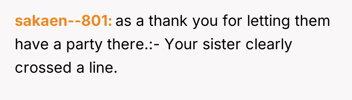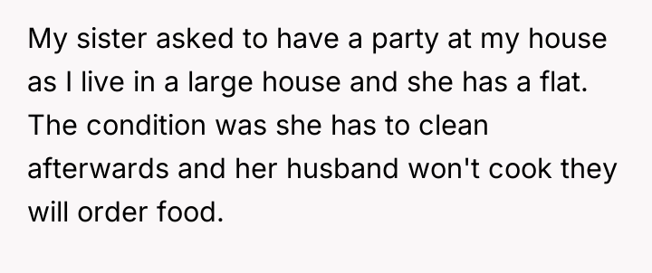 The sister's behavior—trashing the home, leaving dirty dishes, and consuming alcohol without consent or compensation—demonstrates a clear lack of consideration, potentially fueled by a perception of entitlement derived from her superior financial status and the OP's role as a stay-at-home mother. The family's reaction, especially the mother's suggestion that the OP should have preemptively banned the consumption of their own alcohol, represents a harmful inversion of responsibility. Instead of holding the guests accountable for breaching the initial agreement (cleaning, ordering food), the burden is shifted onto the host (the OP) to micromanage behavior, which is a common dynamic where perceived financial or domestic roles dilute one's right to set standards.