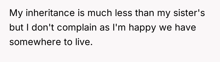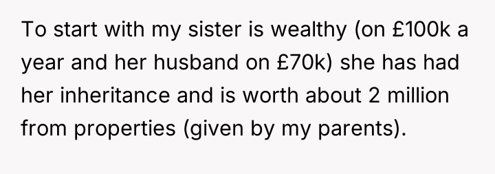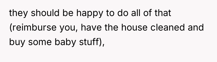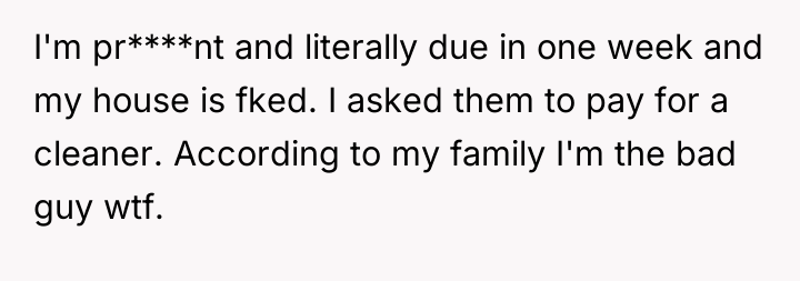 The original poster (OP) is facing significant distress as a heavily pregnant woman whose house was left in a state of disarray following a party hosted by her financially secure sister, violating agreed-upon terms regarding cleaning and catering. Despite the substantial mess and the OP's physical vulnerability, the broader family has sided against the OP, suggesting that their inherited home and status as a stay-at-home parent negate their right to request compensation or basic respect for their property.