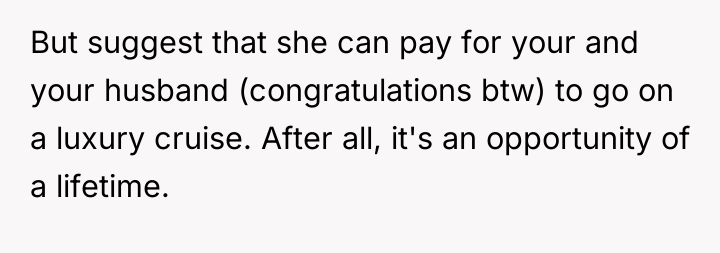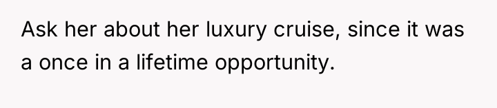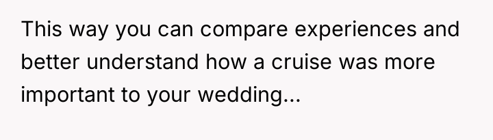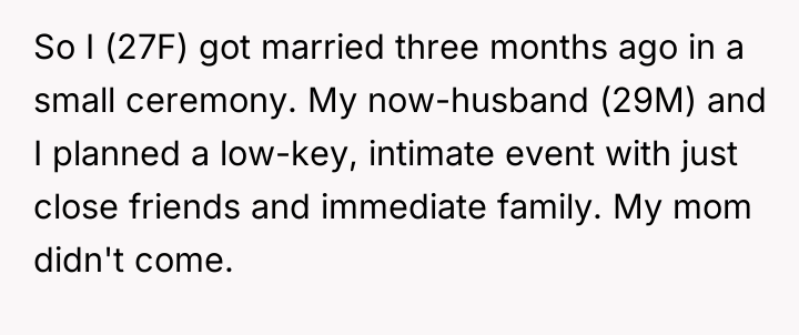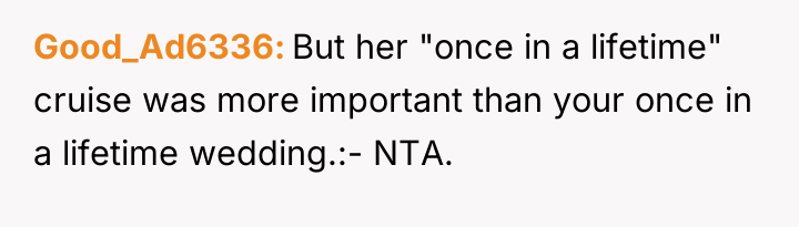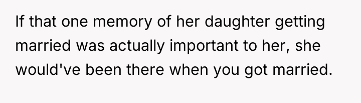 The core issue here revolves around conflicting expectations and boundary enforcement following an emotionally significant life event. The OP and her husband consciously opted for a low-key wedding, and the mother's decision to prioritize a cruise over attending demonstrated a clear prioritization of her own desires over her daughter's chosen ceremony. The OP's initial acceptance, while perhaps avoiding immediate conflict, has now paved the way for the mother to attempt to rewrite history.