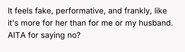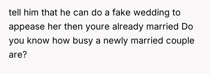 The OP's refusal is appropriate as it defends the integrity of the marriage commitment already made. However, to address the mother's underlying emotional need constructively, the OP should move beyond simply saying 'no' to the large event. A constructive recommendation is to validate the mother's feelings of missing out (e.g., "I understand you feel sad you missed it") while firmly maintaining the boundary against a full second wedding. They could propose a much smaller, alternative acknowledgment, such as hosting a nice dinner or small celebration specifically for the mother and close family, reframing the event as a post-wedding celebration rather than a substitute wedding ceremony.