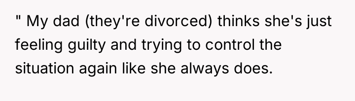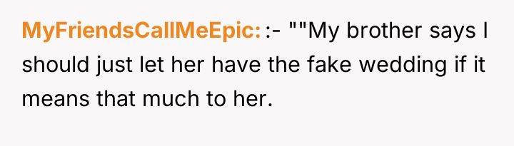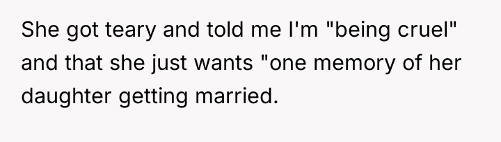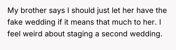 The mother's reaction—demanding a 'real' wedding and labeling her daughter 'cruel'—is a classic manifestation of emotional manipulation rooted in guilt and a need for external validation of her role as a mother. The brother's suggestion to 'just let her have it' ignores the OP's feelings that a second wedding would be inauthentic and performative, effectively sacrificing the OP's autonomy for temporary peace.