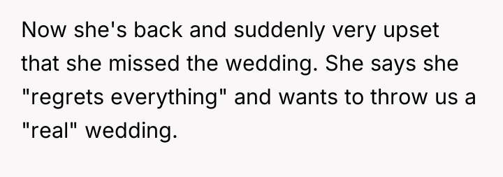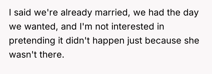 AITA for refusing to let my mom “redo” my wedding after she missed the first one?