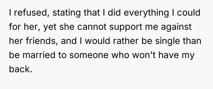 The wife's actions suggest a conflict between maintaining her social circle and validating her husband. Her current distress and willingness to cut off friends indicate she now understands the gravity of her omission. The husband's actions were appropriate in identifying the disrespect, but the recommended path forward would have been to clearly state the non-negotiable nature of this support before marriage, or issue a final ultimatum before moving to divorce. If he chooses to stay, he must require concrete, demonstrable changes in how she handles future conflicts involving friends, focusing on rebuilding trust in her commitment to him as her primary partner.