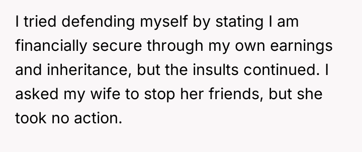 The original poster feels deeply disrespected and unsupported by his wife because she failed to defend him against constant insults from her friends, leading him to initiate divorce proceedings despite his love for her. He believes her inaction shows a lack of respect for him and their marriage.