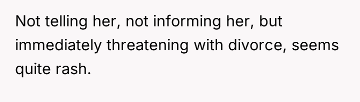 The core conflict here revolves around boundaries and spousal alignment. The husband clearly established a boundary: he requires his wife to publicly support him against insults, especially those questioning his character and motives (calling him a gold digger). When the wife failed to enforce this boundary or defend him, the husband experienced a significant emotional injury, interpreting it as a complete lack of respect and partnership. His reaction—immediately threatening divorce—is an extreme demonstration of enforcing a boundary when communication failed. While his feelings of betrayal are valid, escalating immediately to divorce may bypass deeper discussions about loyalty and relationship expectations.