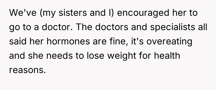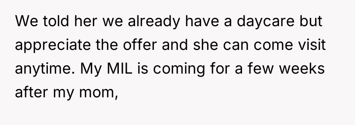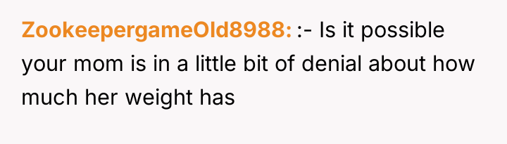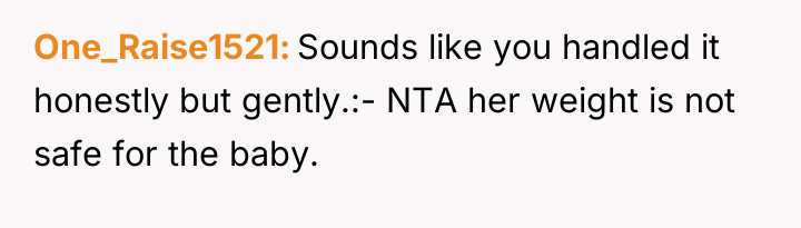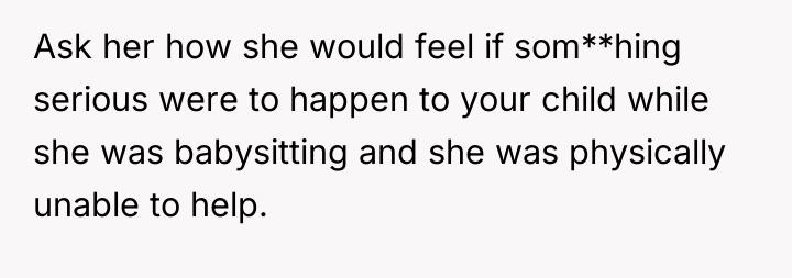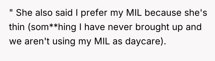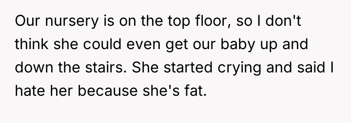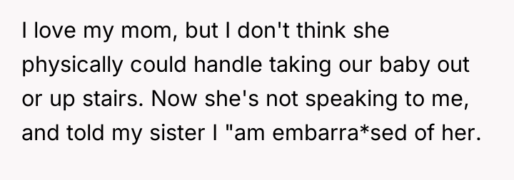 The mother’s reaction of withdrawing communication and accusing the OP of embarrassment or preferring the MIL indicates a failure to accept the boundary based on capacity rather than affection. To handle this more constructively, the OP could have emphasized the environmental constraints exclusively—focusing solely on the stairs and the inability to navigate a stroller/emergency quickly in a walk-up—rather than linking the decision directly to the mother's body size. While the OP was correct to decline the full-time arrangement, framing the rejection around the specific logistics of the apartment layout, rather than the mother's body, often makes it easier for the other party to accept the decision without feeling personally attacked.
