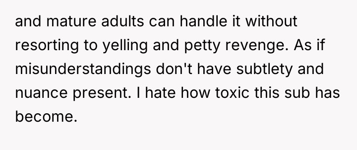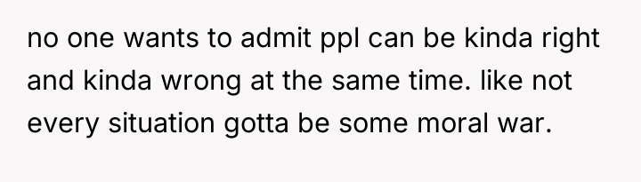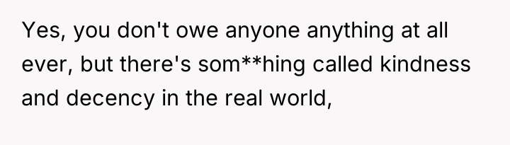 The situation described by the original poster highlights a common tension in online advice forums: the conflict between advocating for personal autonomy (setting boundaries) and acknowledging social obligations (kindness and decency). The OP is reacting strongly to what they perceive as a reductive, black-and-white analysis of a complex interpersonal event, likely one involving a stressful family emergency. When individuals seek validation online, they often receive responses that prioritize theoretical rights over situational context. This can create an echo chamber where commenters project their idealized relationship dynamics onto the OP, leading to harsh judgments when the OP's real-life behavior deviates from that ideal.