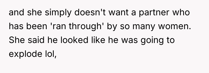 Emily’s initial response—stating the question was inappropriate—was a textbook example of setting a boundary. However, her subsequent tactic of reversing the pressure and then delivering a highly judgmental and untrue statement about his stamina was a form of emotional retaliation. While this successfully terminated the date on her terms, using insults rooted in sexist double standards (judging men harshly for high partner counts while she was initially pressured) complicates the ethical standing of her exit. Psychologically, her final move provided her with a feeling of regained power, but it replaced one form of aggression (Jack's intrusive questioning) with another (her blunt rejection and exit).
