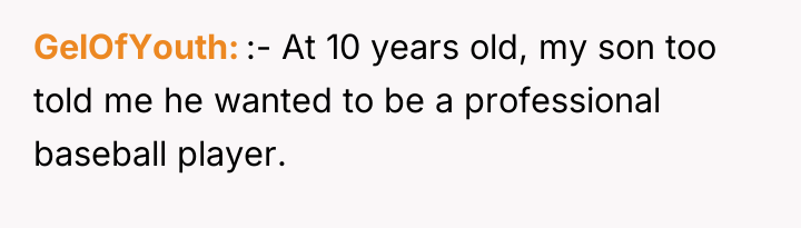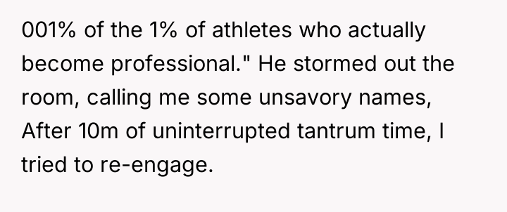 The father positioned himself as a realist, attempting to temper his ten-year-old son's aspirations regarding professional sports with stark statistical probabilities. This created a conflict between the father's desire to impart pragmatic life lessons and the son's need for emotional validation regarding his dreams, leading to an immediate emotional breakdown and rejection of the father's subsequent attempts at reconciliation.
