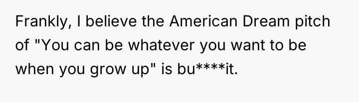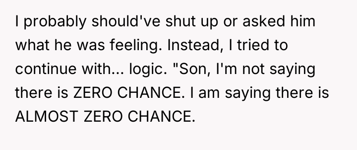The core issue stems from a failure in communication timing and delivery, particularly when responding to a potentially vulnerable question posed on a significant day (the father's birthday). The son was likely seeking affirmation or shared wisdom; instead, he received a crushing statistical deconstruction of his ambition. The father openly admits his belief that the "American Dream pitch" is false, suggesting his motivation was to deliver 'the truth,' but truth delivered without scaffolding or empathy often registers as rejection or invalidation to a child. The father’s instinct to revert to 'more logic' after seeing the initial tears highlights a pattern where intellectual correctness overrides emotional attunement.