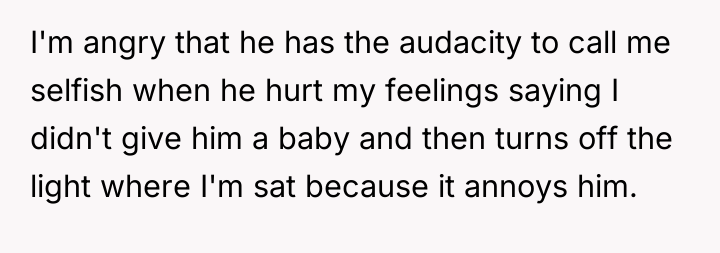 The original poster (OP) is navigating profound grief and physical pain following four miscarriages, while also dealing with her husband's expressed frustration about the lack of a biological child. The central conflict arises when the husband labels the OP as selfish for focusing on her medical situation, immediately followed by a dismissive action—turning off the living room light—which the OP interpreted as a significant act of disrespect and control.
