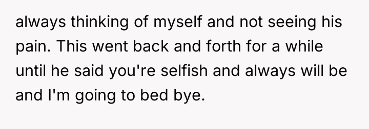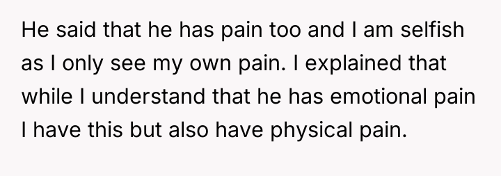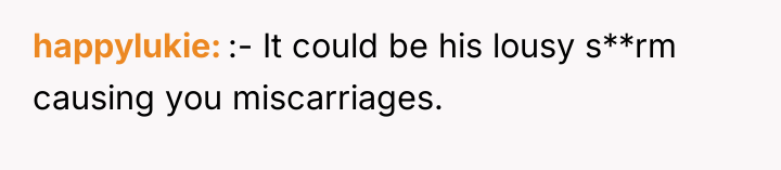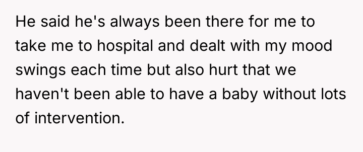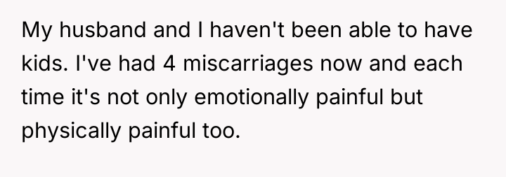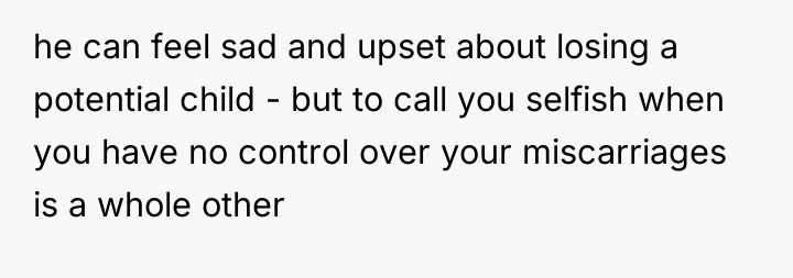 Given the intense emotional strain and the husband's harsh accusation, the core question remains: Does the husband's acknowledged pain about not having a child justify his insensitive comments and subsequent disrespectful behavior, or do the OP's physical and emotional suffering from recurrent pregnancy loss require him to offer unwavering support and sensitivity, regardless of his own feelings?
