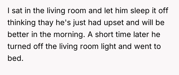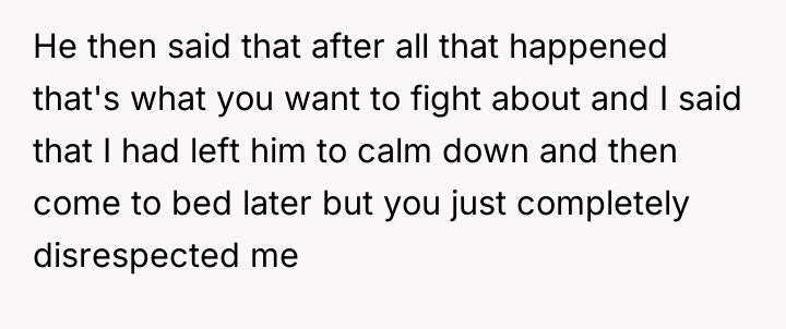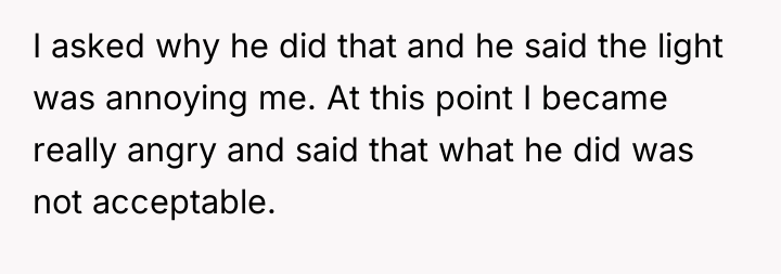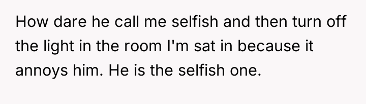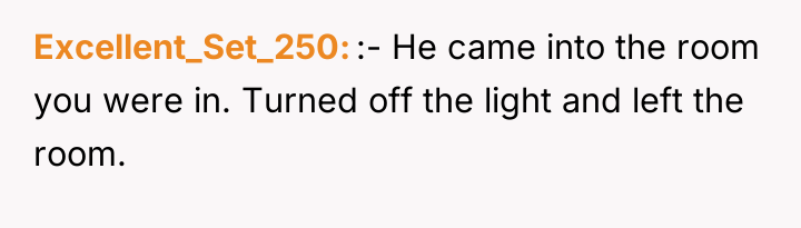 The husband's subsequent action—turning off the light—is a passive-aggressive maneuver that escalates the dynamic from verbal argument to controlling behavior. When the OP confronted him about this specific act, he deflected by minimizing it as a trivial issue compared to the overall topic of children, thereby avoiding accountability for disrespect. The OP's reaction, while fueled by anger, focused on this clear boundary violation (being dismissed while physically present) after attempting to give him space to cool down, indicating a need to re-establish mutual respect within the shared space.
