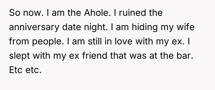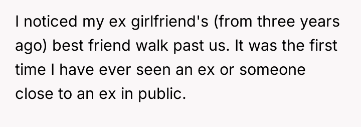 The situation highlights a critical failure in emotional regulation and communication under pressure. The OP experienced high anxiety upon seeing someone connected to his past relationship, leading him to an immediate avoidance tactic (changing rooms). While his motivation was to prevent drama, this action was perceived by his wife as suspicious or as an attempt to conceal her, suggesting a lack of trust or an attempt to control their shared environment. The wife’s reaction—instantly escalating to yelling, making a scene, and immediately jumping to extreme conclusions (infidelity, hiding her)—indicates poor emotional regulation and a pattern of negative interpretation of the OP's neutral or well-intentioned behavior. This dynamic suggests an underlying foundation of insecurity or chronic conflict in the marriage where benign events are filtered through a lens of potential betrayal.