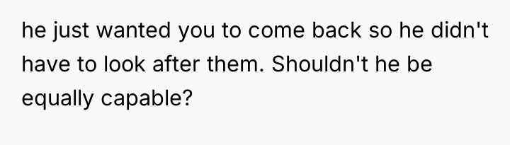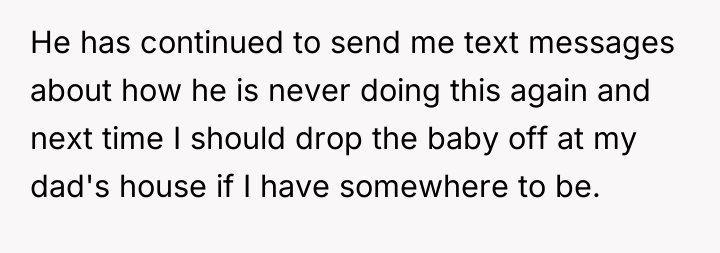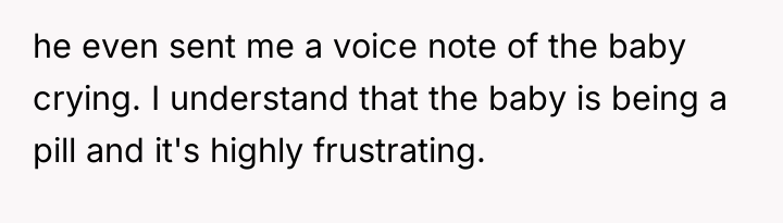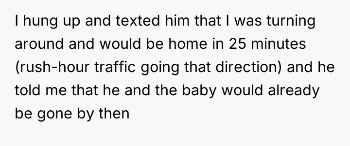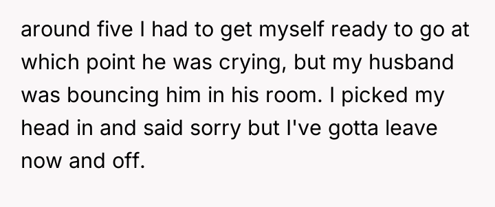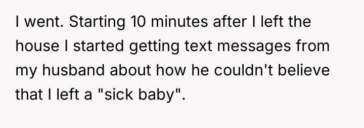 The husband's behavior, characterized by guilt-tripping texts, sending a voice note of the crying baby, and issuing ultimatums about future support, demonstrates poor boundary setting and an unhealthy communication pattern. The primary conflict is not the dinner itself, but the sudden withdrawal of support and the use of emotional leverage after the wife had already left, which undermines her autonomy and professional standing. The wife, after checking in and offering to return, acted reasonably given the prior arrangement, but the partner escalated the situation by changing the terms post-departure.
