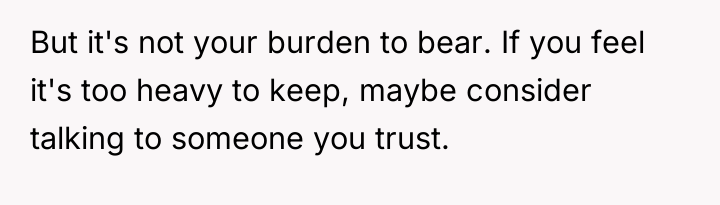 The narrator is experiencing a significant burden, often referred to in psychology as 'secret keeping trauma' or inheriting 'legacy burdens.' The grandmother, facing mortality, sought catharsis by transferring a heavy secret to the most trusted confidant present—the narrator. The conflict here is ethical and emotional: the promise made to the dying versus the principle of autonomy and truth for the living, especially the mother. The narrator's current inaction—waiting until 'they are okay'—is a form of avoidance motivated by empathy and fear of causing immediate pain, which is understandable given the context of recent loss. However, this delay risks transforming the secret into a foundational element of the narrator’s relationship with their mother and the family structure.